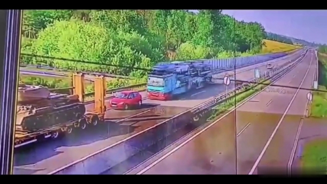 The footage shows one of the trucks, transporting a tank to a show near Karviná, stopped on the side of the road. A passenger car stopped right behind it. Further on, we see a passenger car driving past, and right behind it another truck transporting cars. The driver of this truck does not try to slow down or brake. He hits the stopped passenger car with force, which then drives up to the truck transporting the tank.