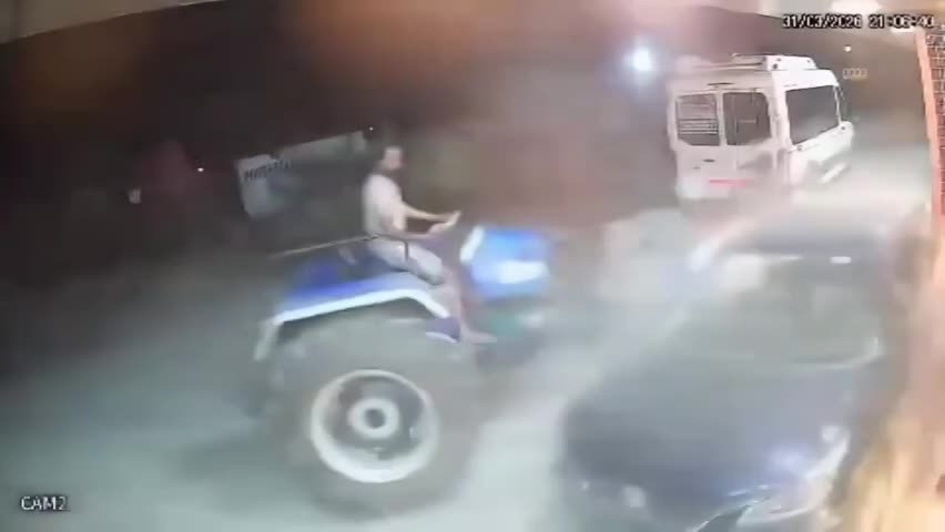 Kaladhungi, India, March 31 — A tractor driver rammed a parked car multiple times outside a roadside eatery with two men inside.